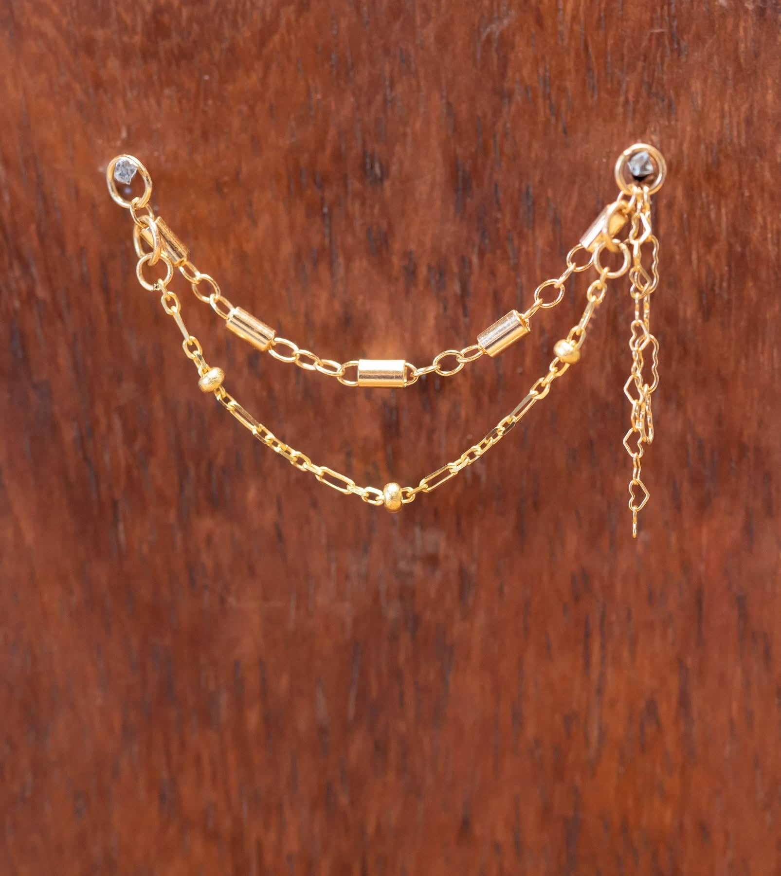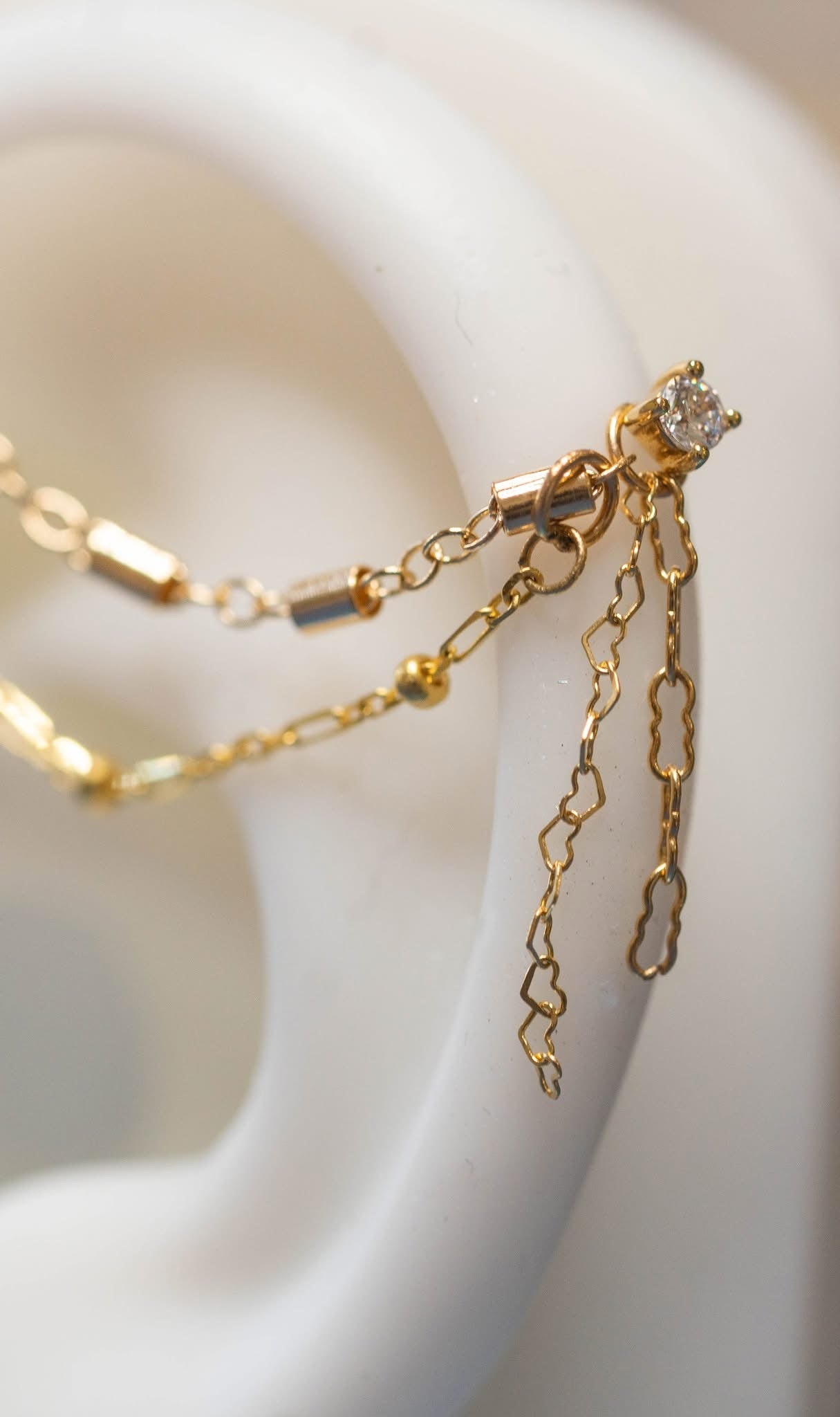 14k GOLD DOUBLE EAR CHAIN - CYLINDER AND BEADED CHAINS - CRINKLE AND MICRO HEART CHAIN ACCENTS