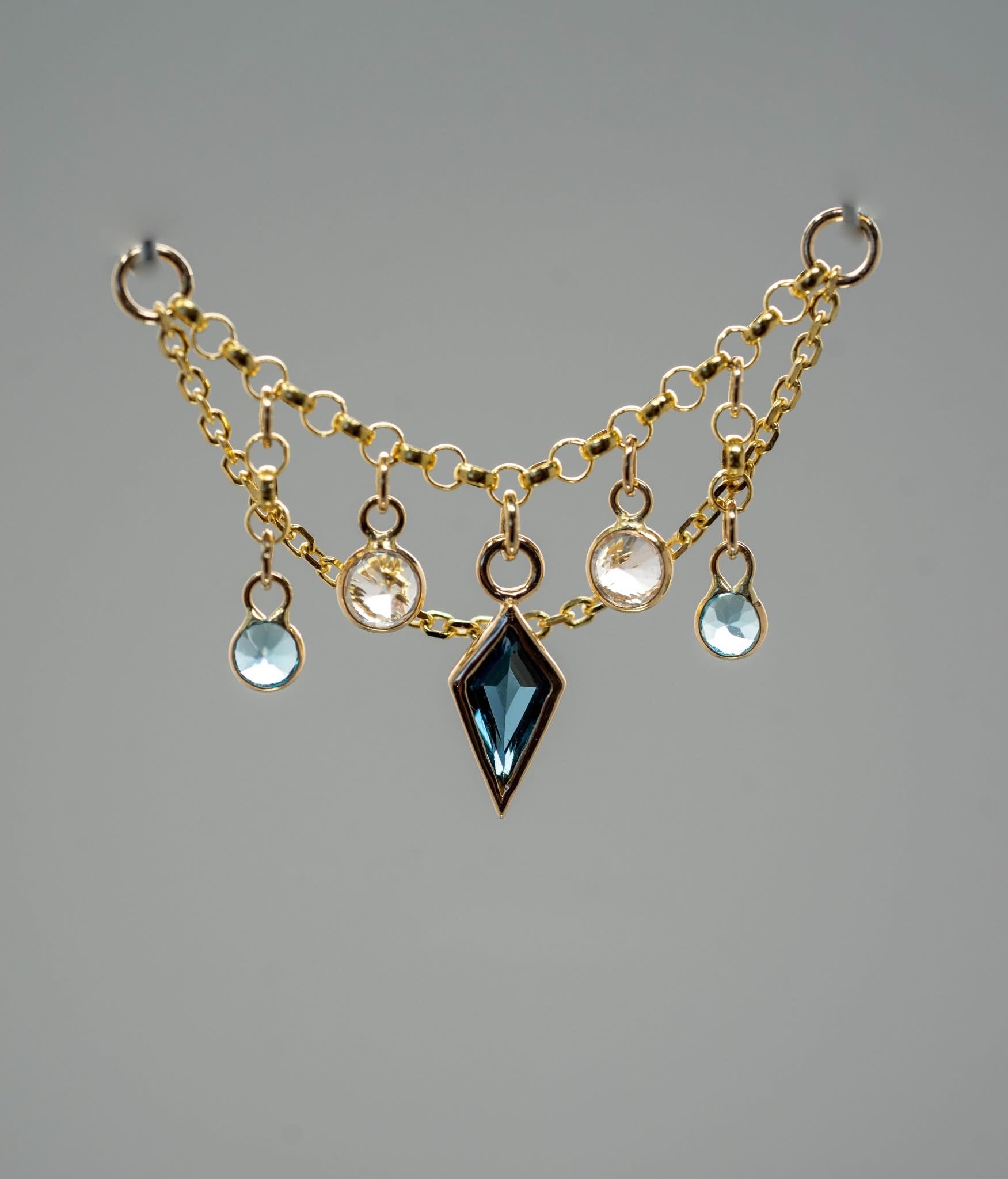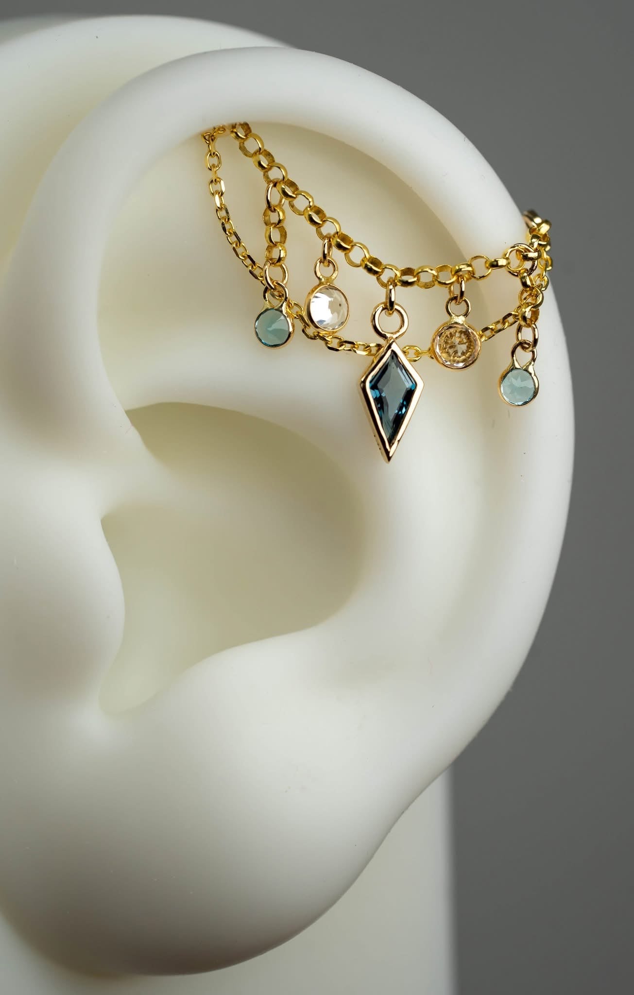 14K GOLD DOUBLE EAR CHAIN - LONDON BLUE TOPAZ - WHITE SAPPHIRE - SWISS BLUE TOPAZ