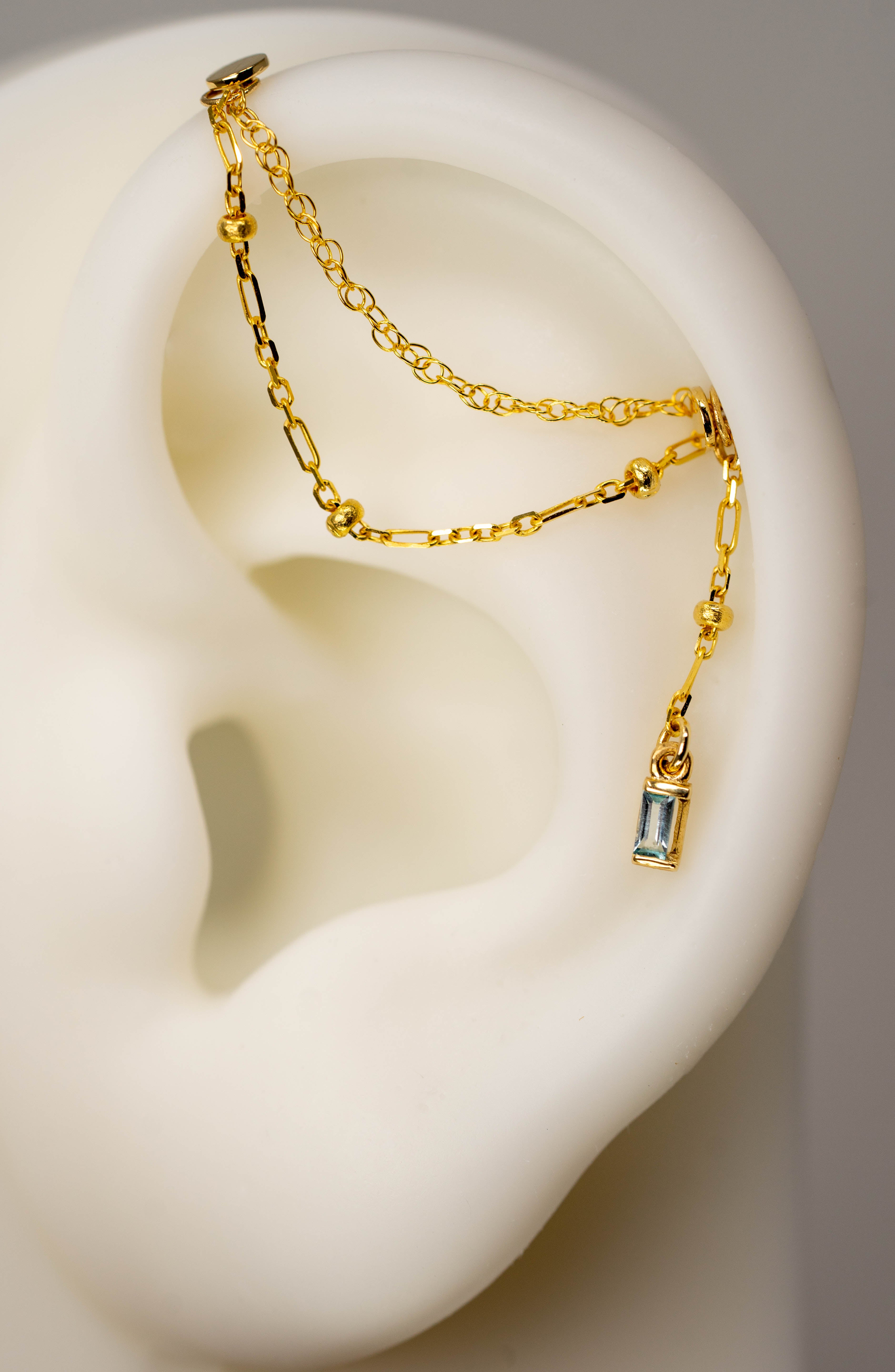 14k GOLD DOUBLE EARCHAIN - AQUAMARINE BAGUETTE CHARM
