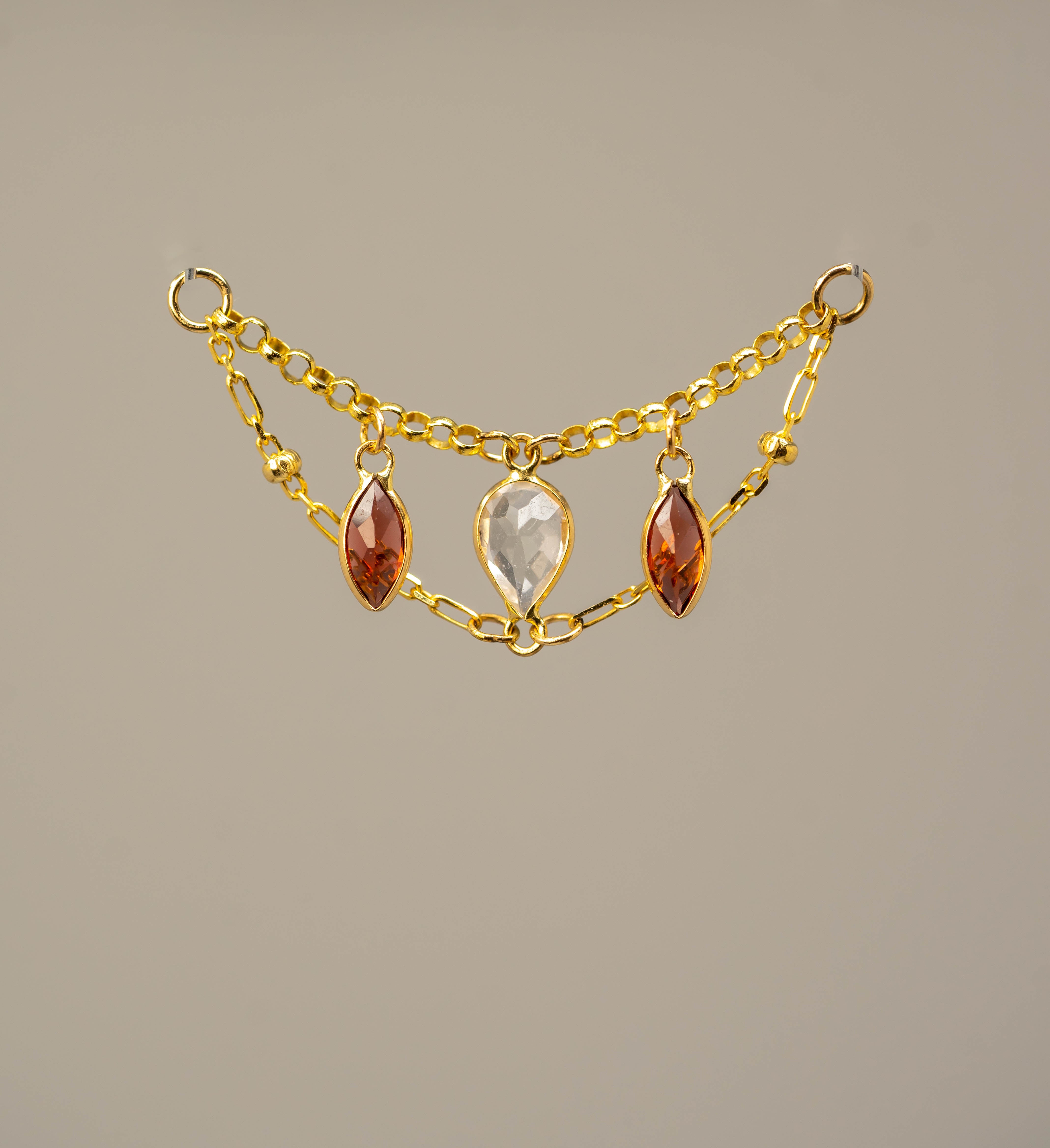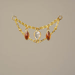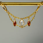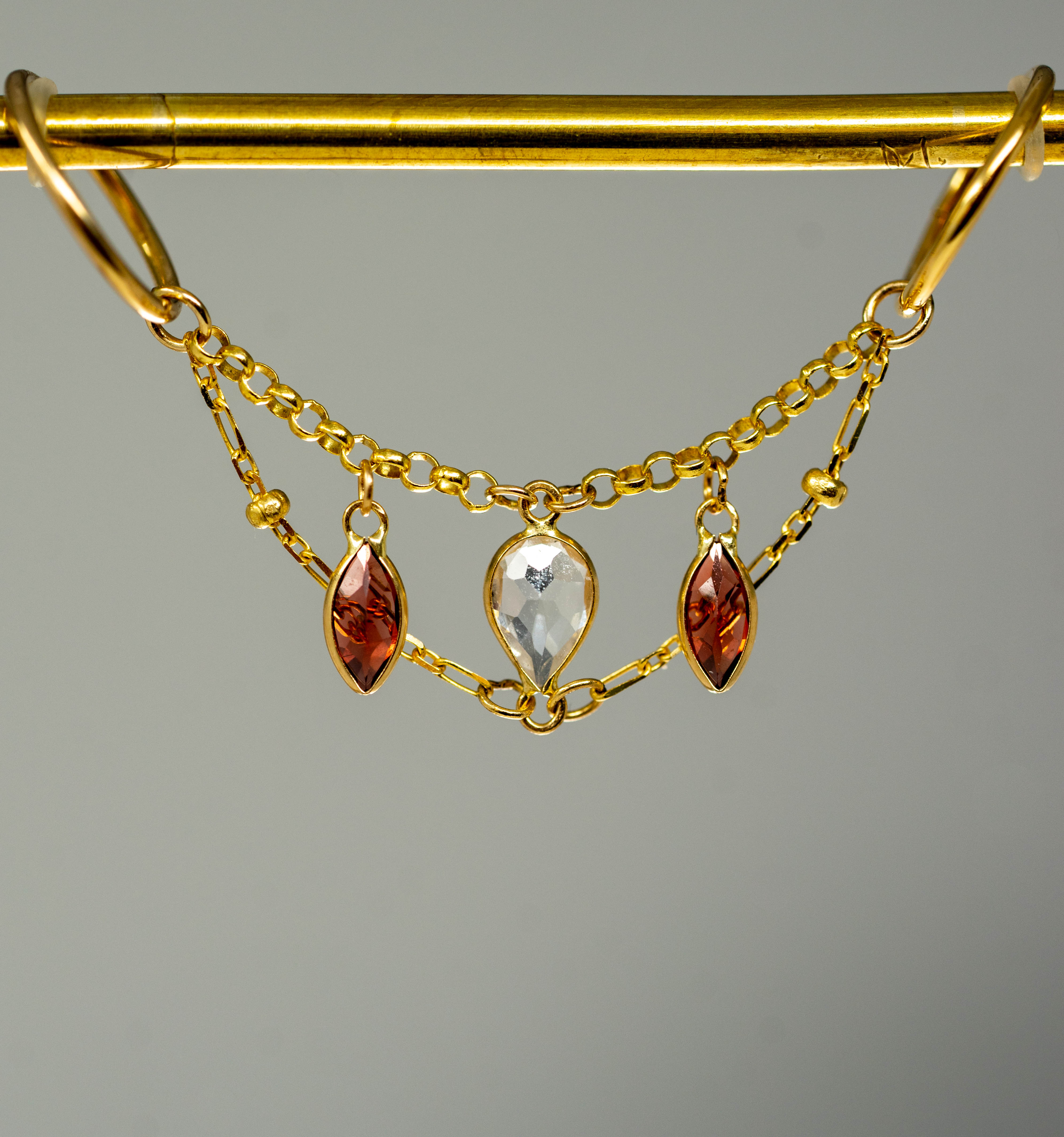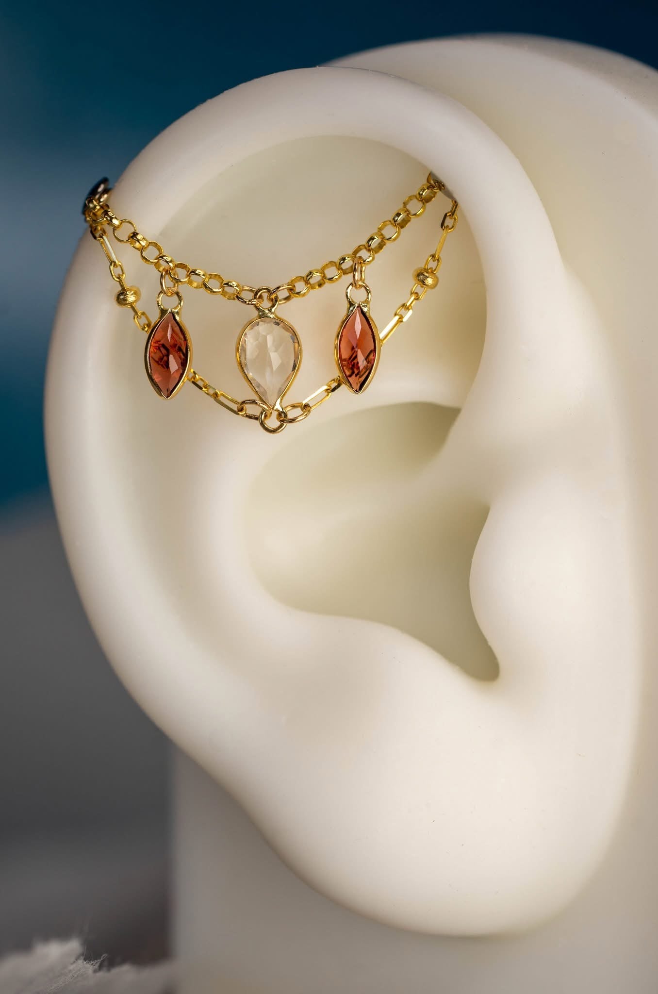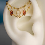 14K GOLD GARNET AND WHITE TOPAZ DOUBLE EAR CHAIN