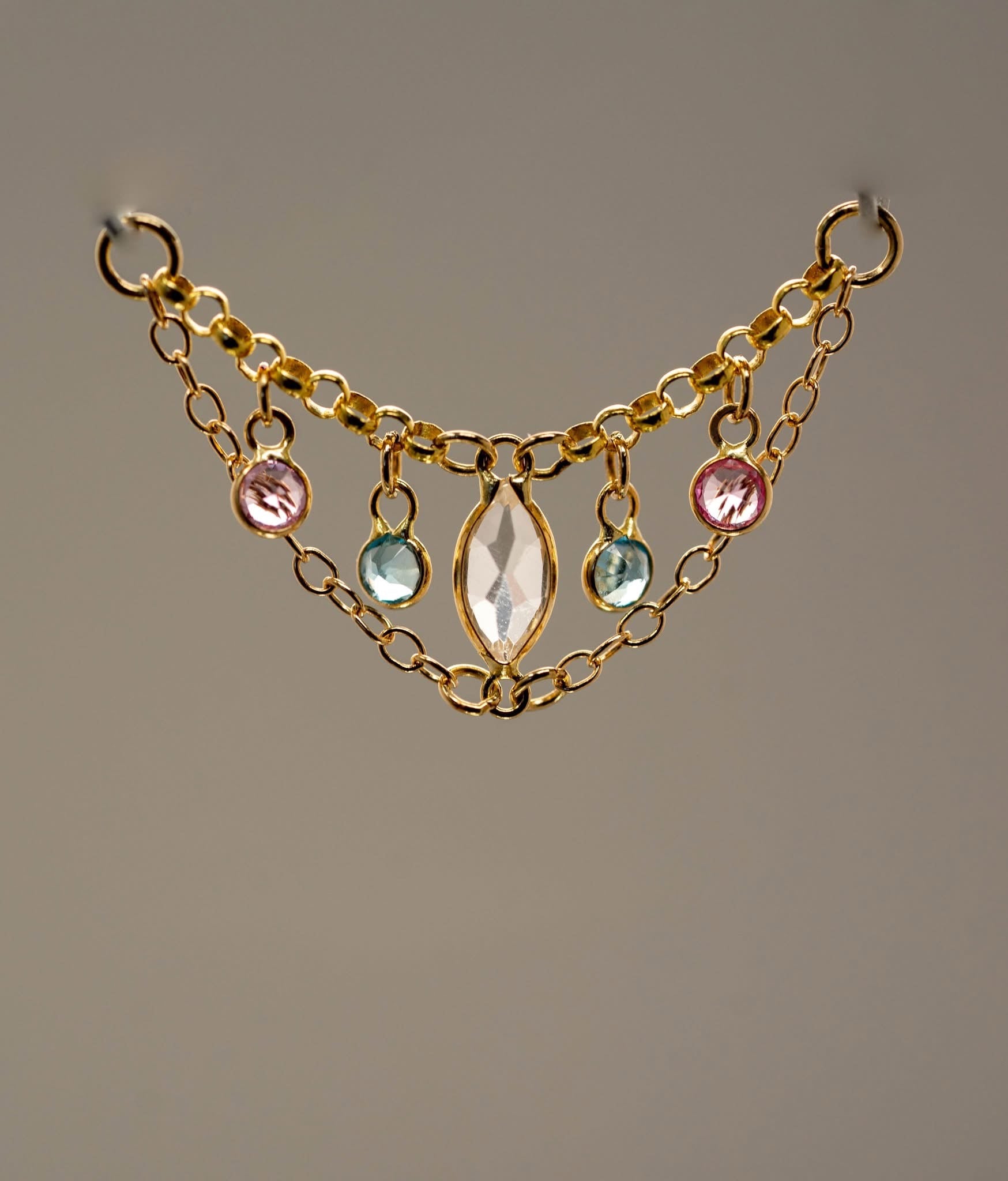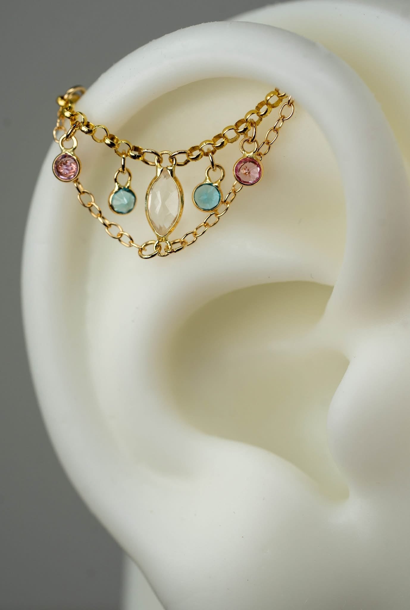 14k GOLD - LINKED DOUBLE EAR CHAIN - WHITE TOPAZ - PINK SAPPHIRE - SWISS BLUE TOPAZ