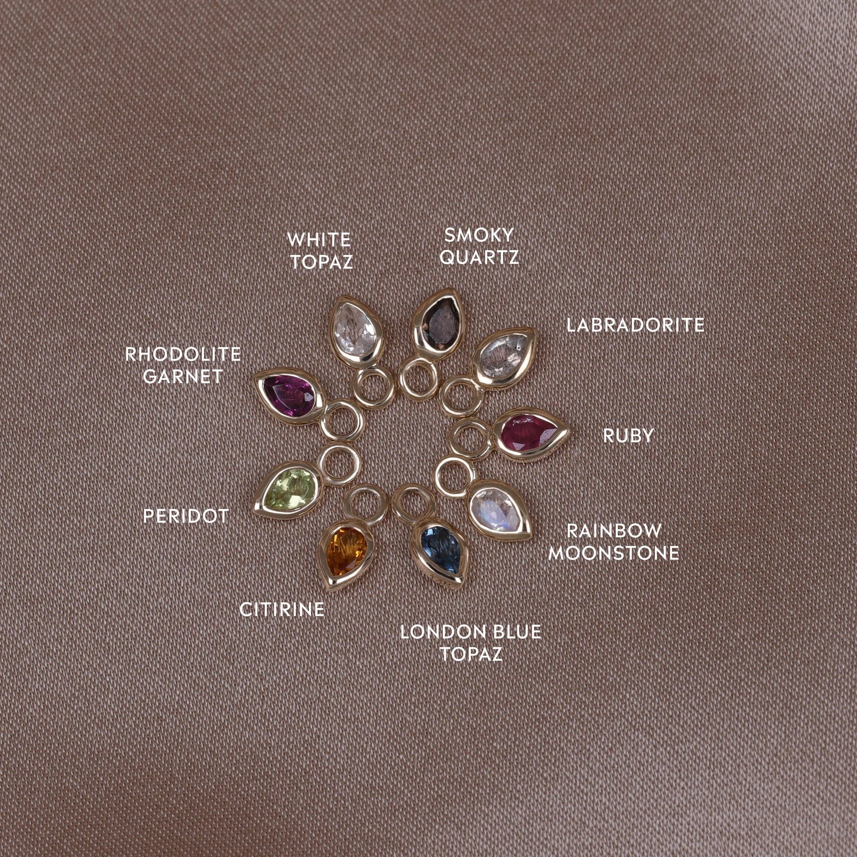 - Gemstone: White Topaz, Smoky Quartz, Citrine, Peridot, Labradorite, Rainbow Moonstone, London Blue Topaz, Rhodolite Garnet, Ruby