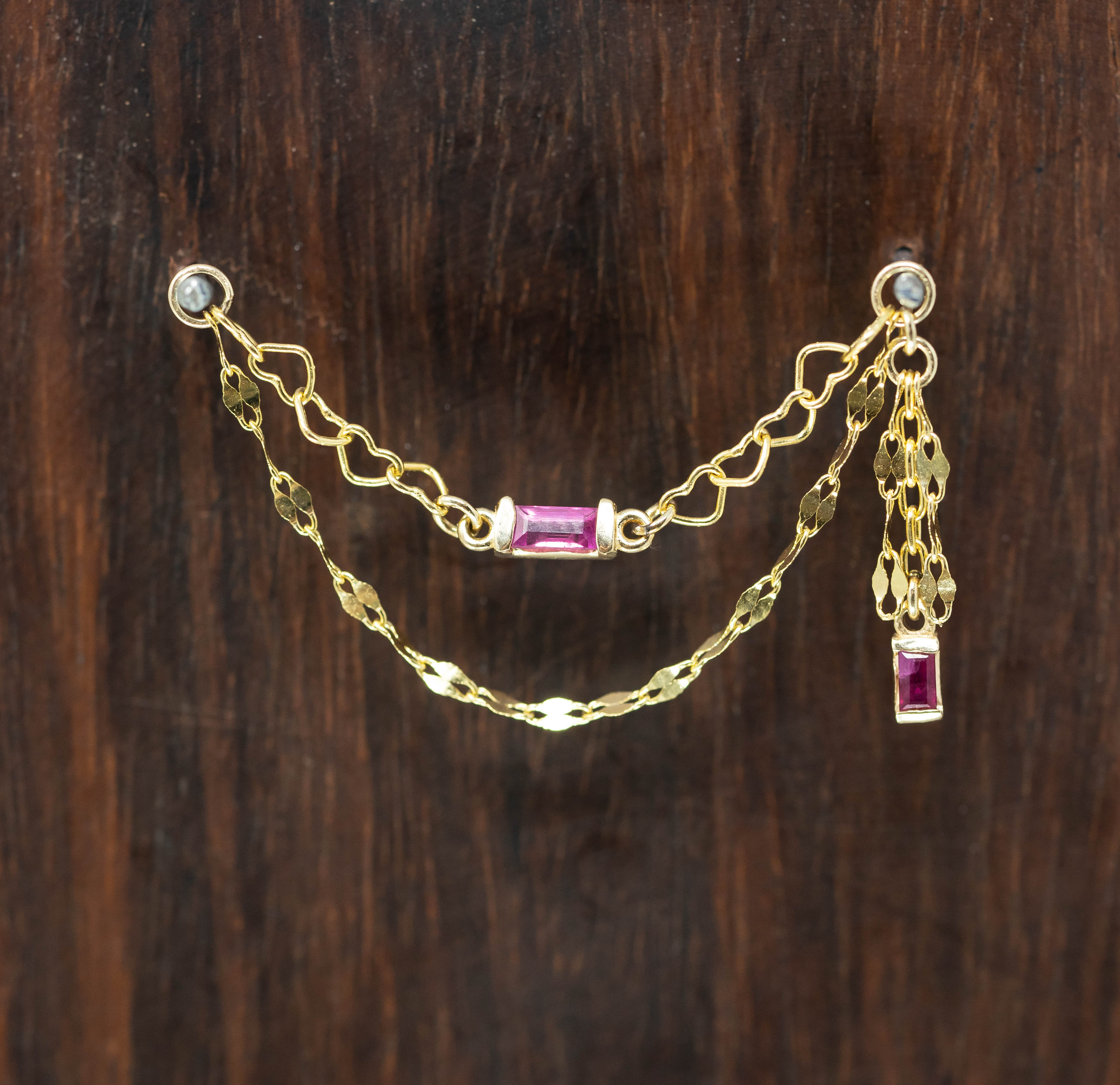 14k Gold Double Ear Chain With Two Ruby Baguettes, Heart and Tile Chains